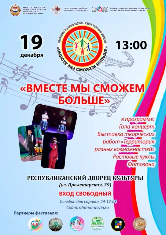 Открыт прием заявок на Республиканский инклюзивный фестиваль художественного творчества «Вместе мы сможем больше», который пройдет 19 декабря в 13:00 на сцене Республиканского Дворца культуры (г. Саранск, ул. Пролетарская, 39).